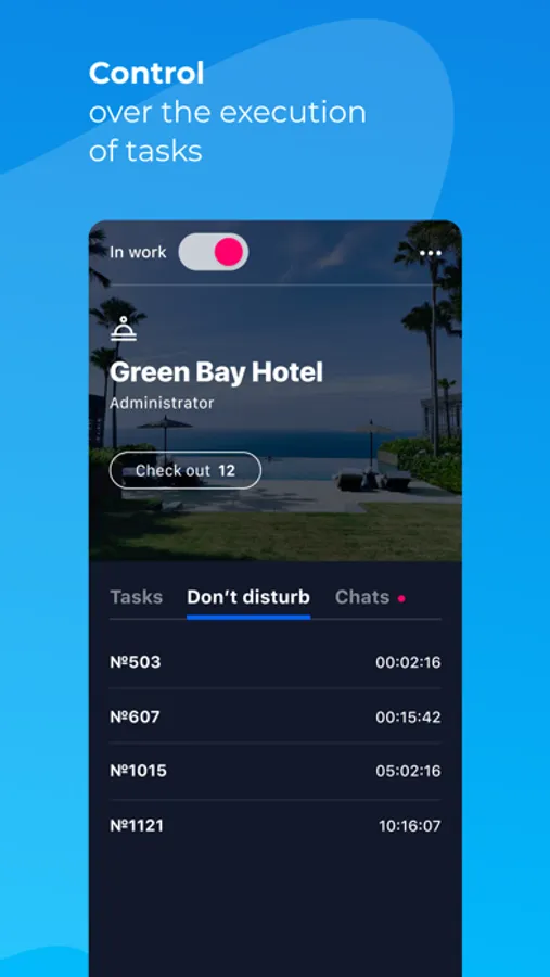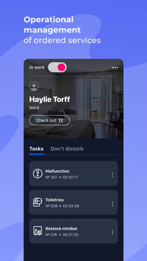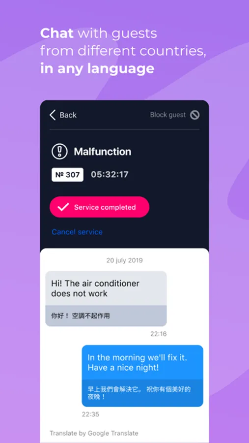 Working together, the service and application allow you to quickly and efficiently respond to requests from your hotel guests. Accept orders for paid and free services in one click. Communicate with guests in a language you prefer.