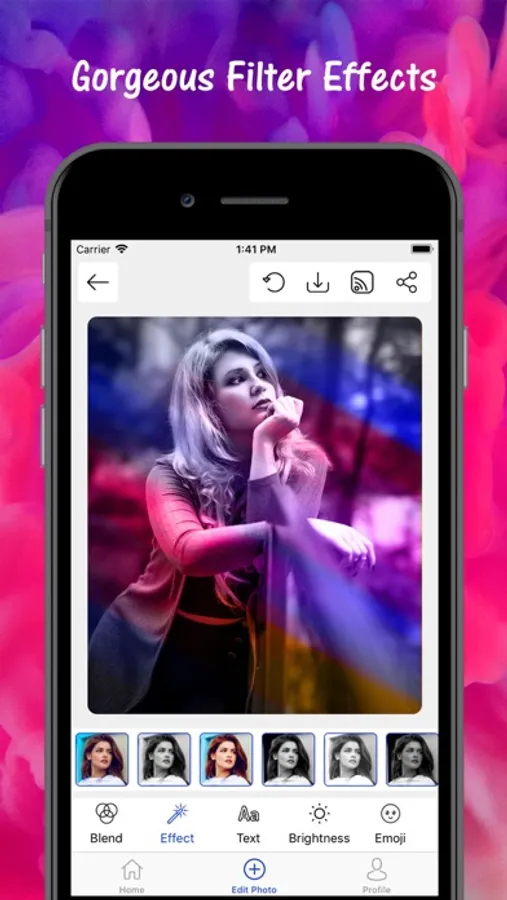 Not only can you apply the photo special effects to your favourite pics, but you can also change the transparency the color filter you've chosen. You will be amazed by the number of different color filter patterns, stripes, curves, various shapes, blend images with rainbow changing colors and be creative.
