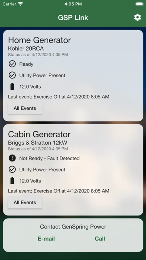 GenSpring Link presents the current status of your generator system any time on your iPhone or iPad, and push notifications keep you up to date as events occur: exercise, generator running, utility power status, and faults. Each day our GenSpring Link monitor reports the status of your generator, including battery voltage, to your GenSpring Link app.