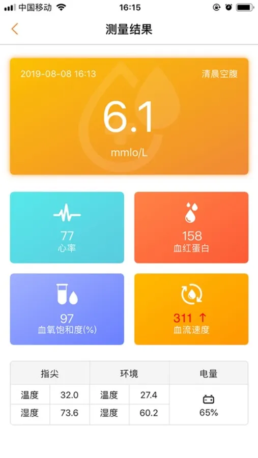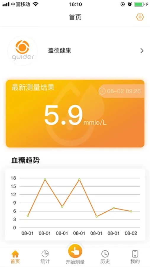 盖德健康无创血糖APP为您提供便捷的健康血糖检测方式。结合APP,使用无创血糖仪,您可以用一只手指随时随地进行测量,测量过程中无创、无痛,并且一次获得多项健康数据,随时随地测量、记录、追踪、查询与管理,以方便您全方面了解您的血糖健康状况。