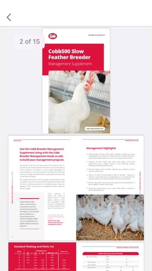 Customers may also access Cobb expertise through the app with readily available resources like Cobb management guides, supplements, technical posters, articles, and more.Customers may also access Cobb expertise through the app with readily available resources like broiler breeder guides, technical articles, and more.