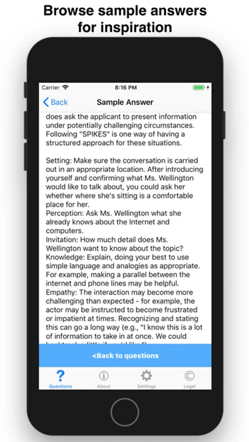 For many applicants, having limited time to come up with an organized answer to a question prompt can be stressful and is not something that comes naturally. With practice, the process can become significantly less intimidating. This app includes hundreds of practice questions and a selection of sample answers to help structure responses.