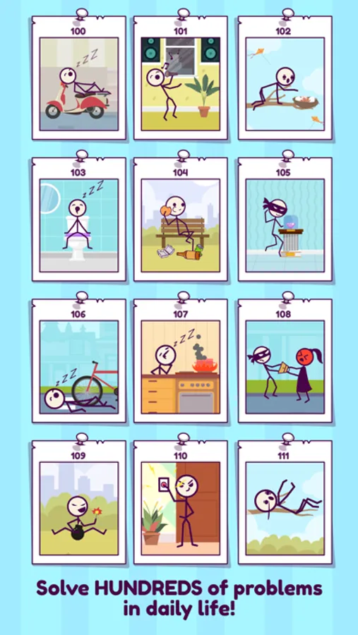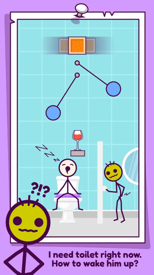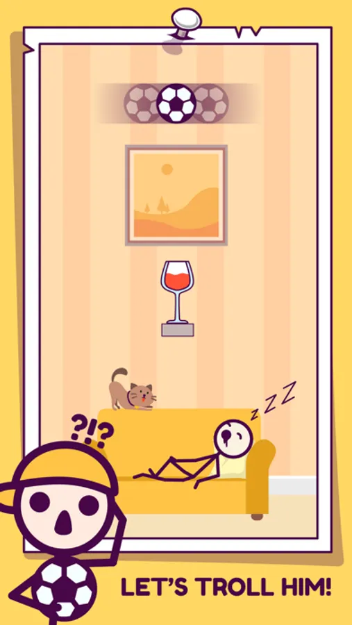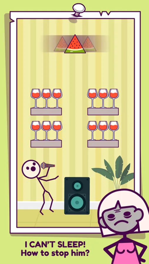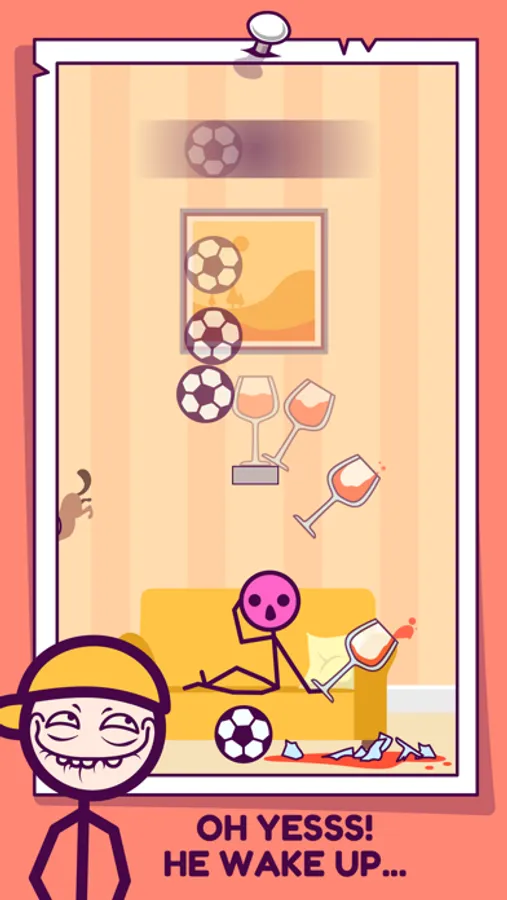 Stick man is a bad guy. Drop the ball and break the glasses to stop him.