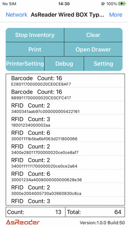 This app is a application for the AsReader Wired BOX-Type provided by Asterisk. With this application, the Wired BOX-Type can connect to an iOS device and read RFID tags. It can also display the reading results from a barcode reader connected to the Wired BOX via USB, print receipts from a printer, and more.