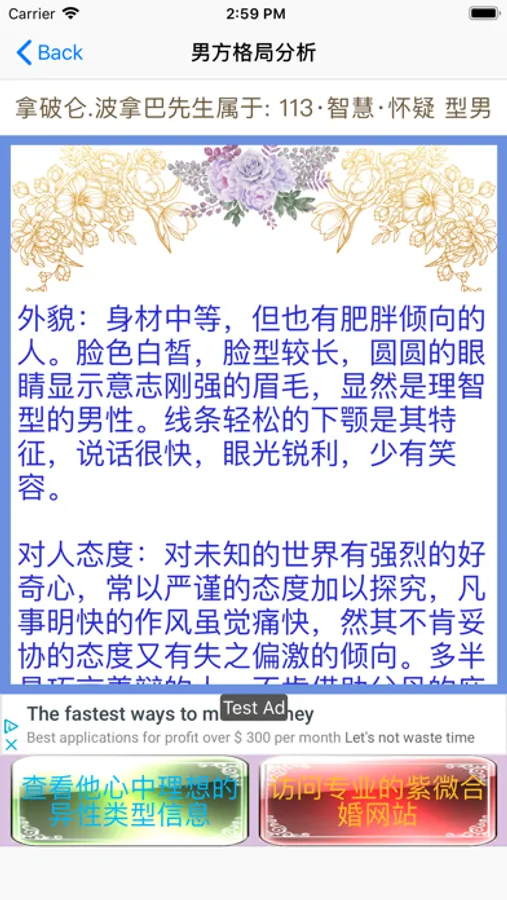 它包括了每种类型男女相应的最佳配偶特质、次佳配偶特质、一见钟情特质、应避免之特质等信息,并对对方的外貌、性格、外在交际态度、婚姻运、配偶信息等有详细的阐述与剖析!