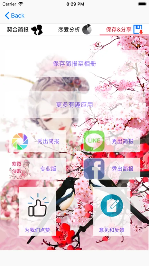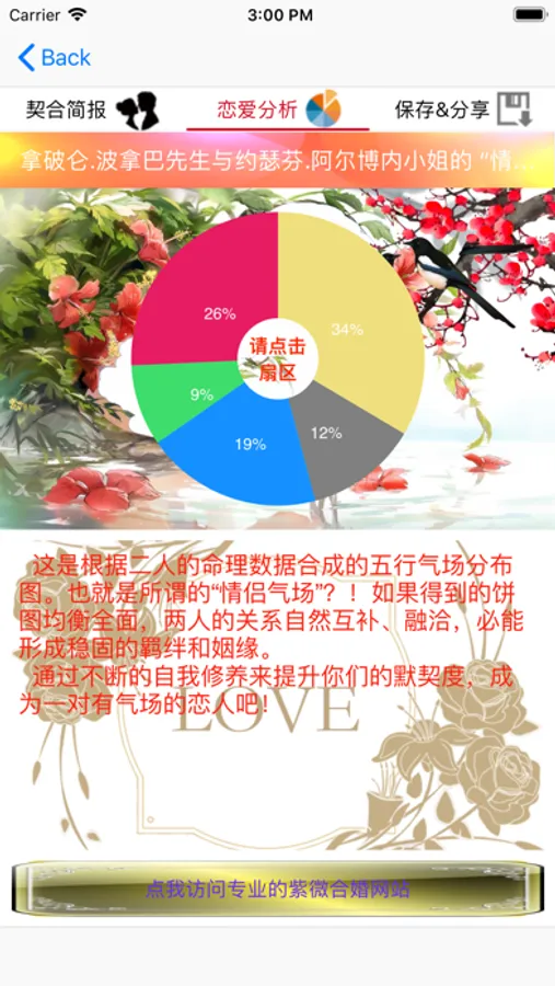 根据我国传统紫微合婚术,配合双方的八字五行气场。经统计量化,分析得到通俗易懂的恋爱契合度分数、缘分类型分类等信息。另附有男女双方精准的外貌、社交面孔、潜在性格、婚姻运等分析。并有机会查看对方的最佳适婚对象特质、一见钟情对象特质、反感的对象特质等等信息。预测准确,令人称奇。所生成的简报界面精美,另附一键保存、一键分享简报的功能,快来免费测测并秀出你和TA的契合度吧!