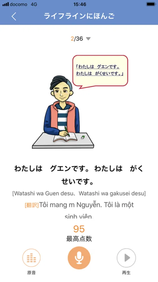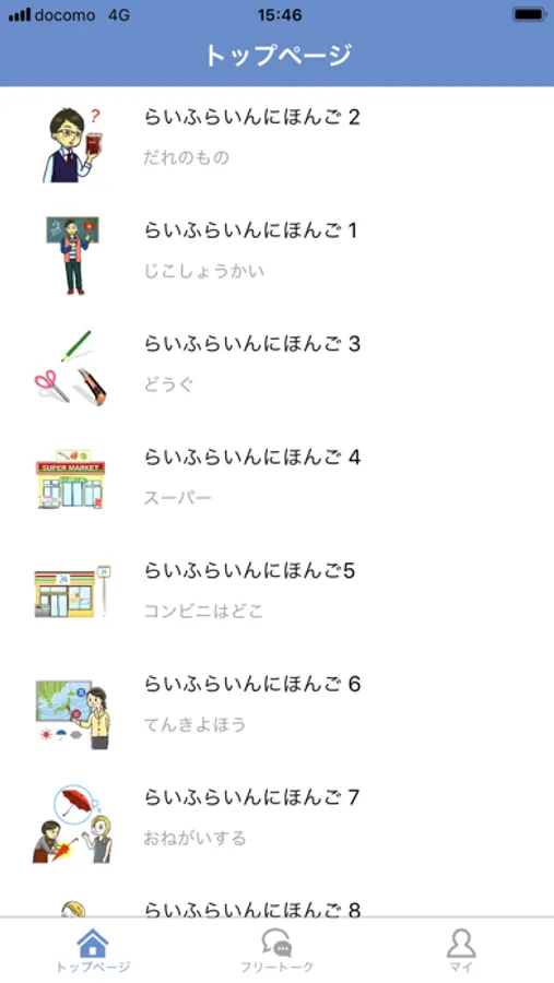 日本の生活に合わせた日本語会話を学べるコンテンツです。オールイラスト付きの日本語会話で学習効率をUP。音声採点機能を搭載しており、楽しく学ぶことができます。