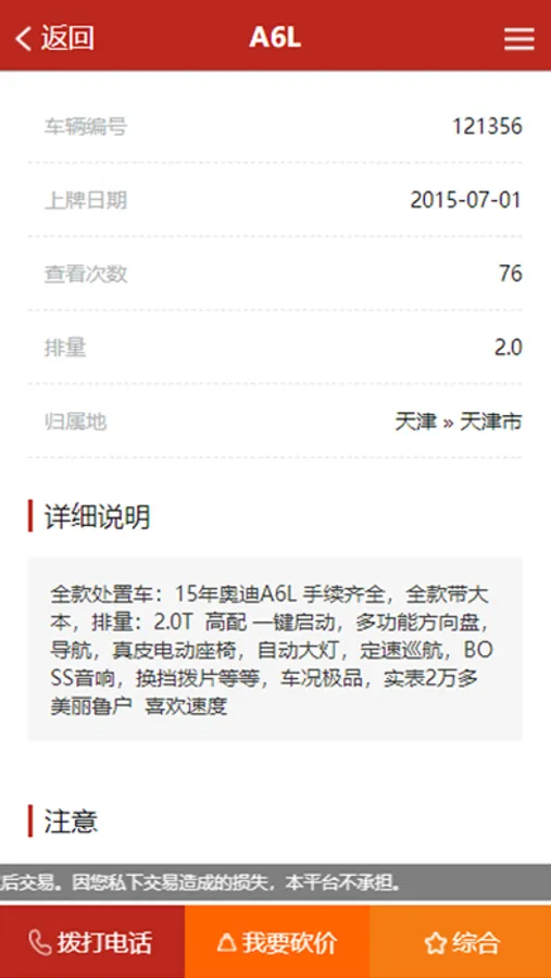久久泰抵押车是一款针对于抵押车交易的网络平台,实现了抵押车在线发布,填写抵押车相关信息,即可完成车源在线发布;在线购买、预定抵押车,对于用户想要咨询的车辆可以实时联系车源卖家,可在线完成交易;车辆价值评估,提交车辆相关信息,反馈车辆估算价值;求购车辆,没有中意车辆时,可以提交自己的需求;问答系统,提交抵押车问题,在线交流相关问题;以及抵押车时事资讯发布,及时了解抵押车资讯。