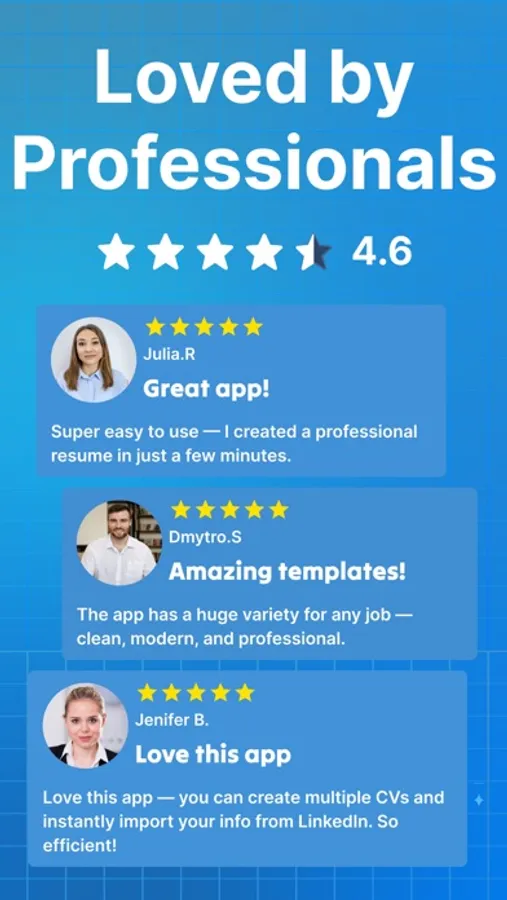Introducing the most comprehensive resume-building app on the market! Our app offers everything you need to create a professional resume and cover letter in just a few easy steps. Whether you're starting from scratch or want to save time using pre-written content, the app has you covered with a built-in skills list and AI-powered technology to help craft perfect text. You can even import your data from LinkedIn with just a few taps.