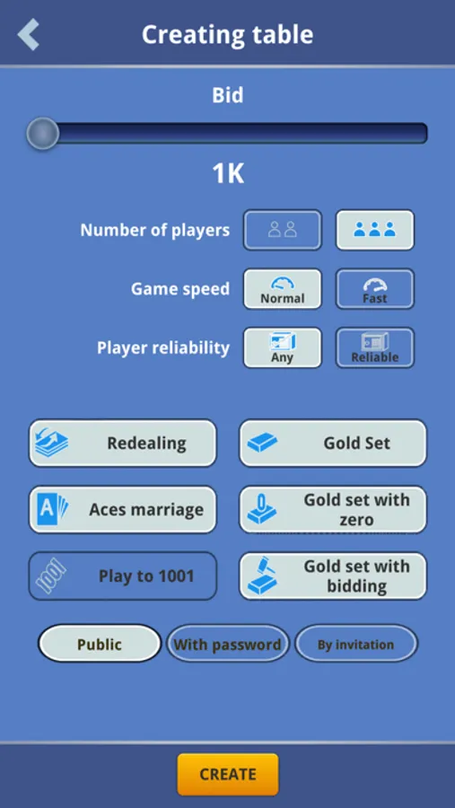 - Setting up access to a table: public/private /password - to play only with your friends.