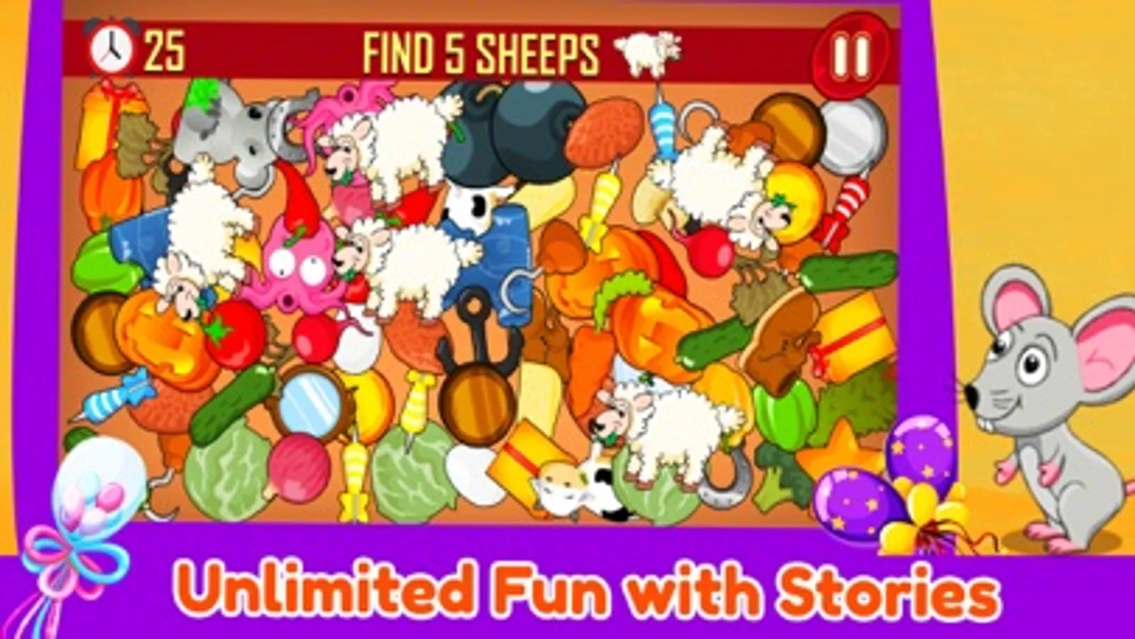 Along with story children are being entertained with two games. In the first game, children need to pop the balloons into the given time. Background sound and voice of popping balloons make this game more interactive. In the second puzzle, children find the objects within the given time. Unlock the stickers after completing a level or achieving high scores. Lion and the Mouse along with story and puzzles is a source of entertainment for kids.