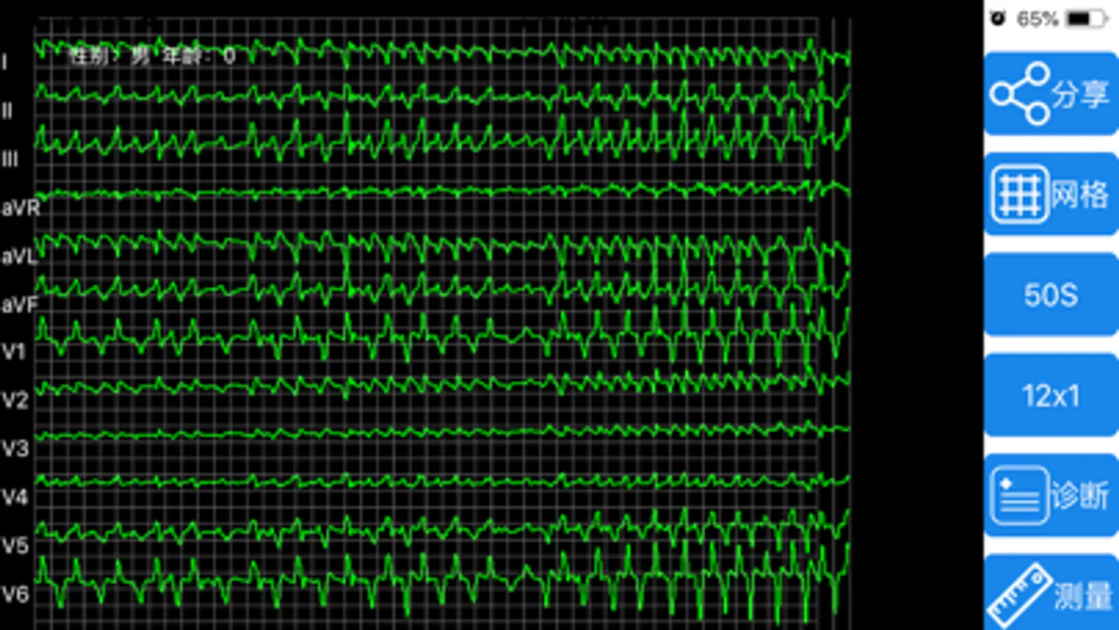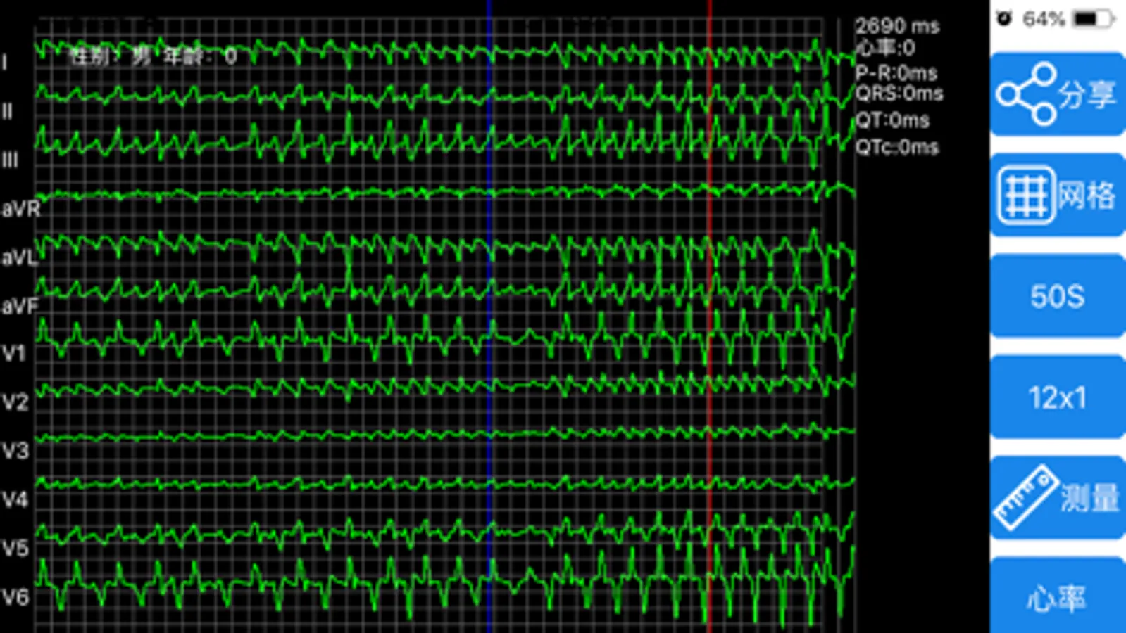 心电测量:可以进行时间、幅度手动测量,可以测量心率、PR间期,QRS时限,RV5,SV1;