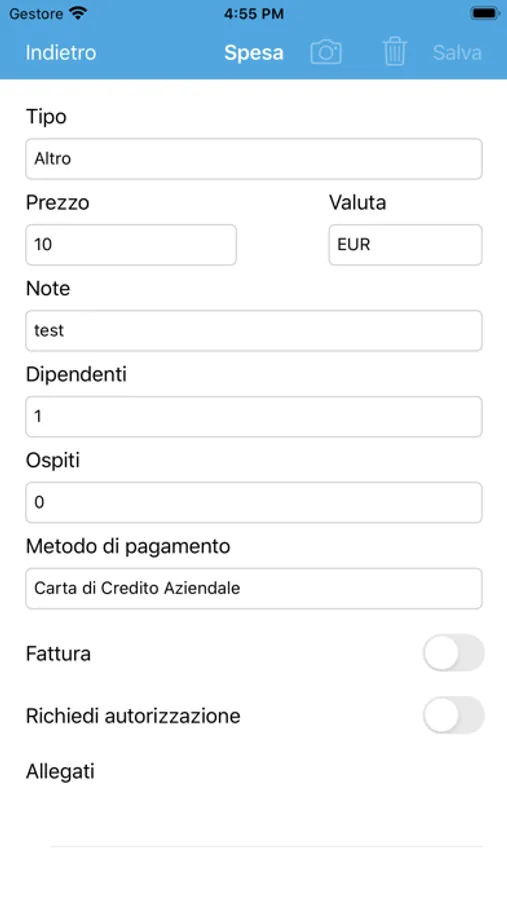 • Caricamento allegati giustificativi