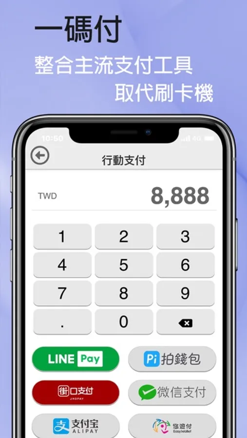 一碼付提供線上及線下訂單查詢、設定消費者收、付款之行動支付工具(包含信用卡、LINE Pay、Apple Pay、Google Pay⋯⋯等),您還可以將行動裝置連接MYPAY【藍芽讀卡機】,讓您的顧客直接使用信用卡/金融卡交易,完全取代刷卡機,絕對是店面收款付款的絕佳利器!