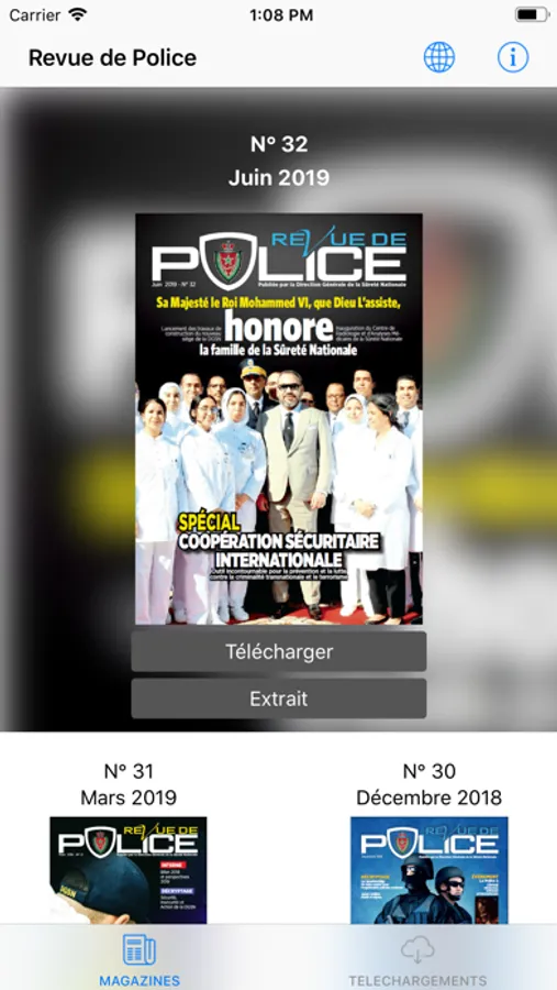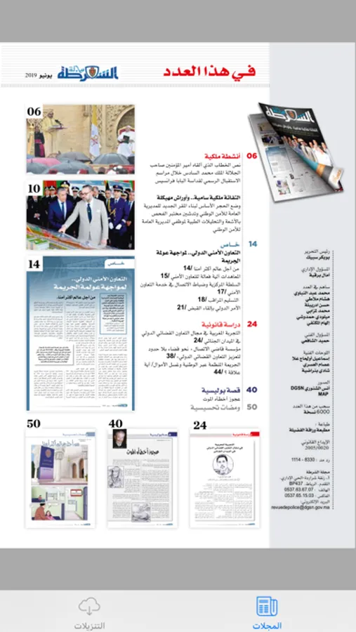 Une nouvelle application baptisée « Revue de Police » est désormais téléchargeable sur votre smartphone. Cette application embarque la version électronique de la Revue de Police qui constitue un support d’information et de communication institutionnelle, édité trimestriellement en langue arabe et française par la Direction Générale de la Sûreté Nationale,