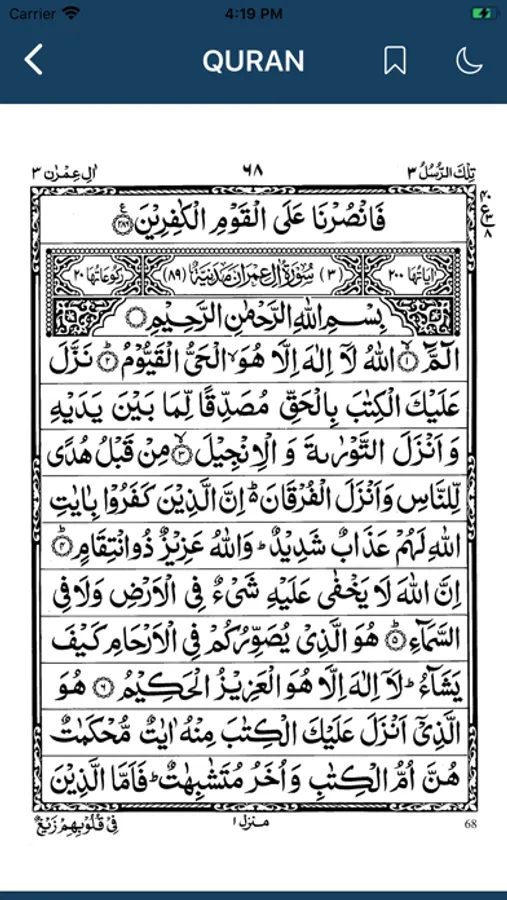 This is a simple application to read Quran in IndoPak script. You can read the Quran in Normal mode or Night mode, Surah wise and Para wise. You can Bookmark any page. You can also search any page and resume from where you left off.