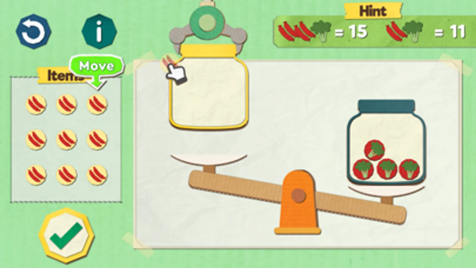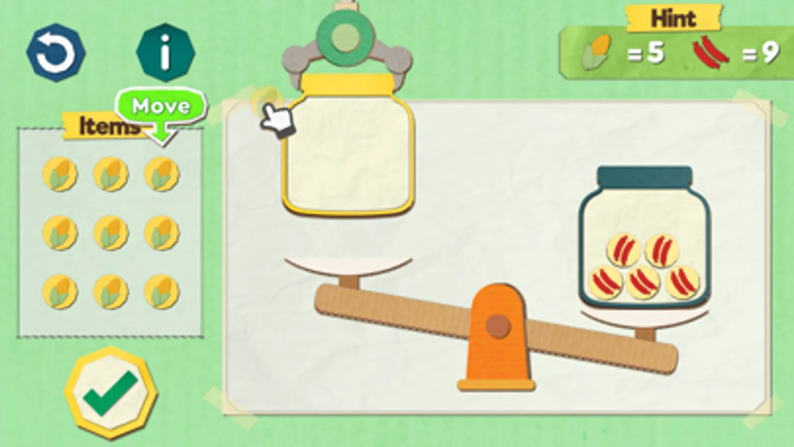 3.Put the weight - try to make the scale balance by move items to left jar.