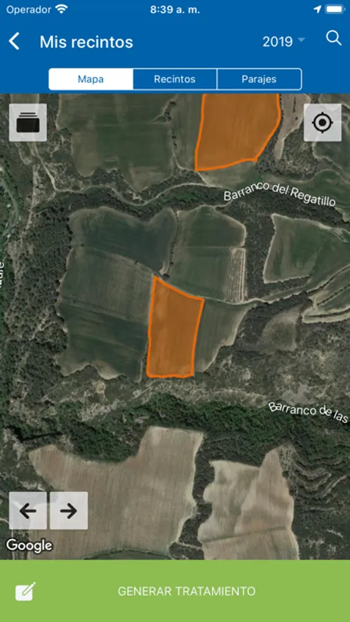 3. Si deseas crear un nuevo tratamiento pulsa en Mis recintos para acceder a la información que has descargado en tu dispositivo, seleccionando la cosecha y los recintos a los que se va a aplicar, y sigue los pasos que indica la app para generar el tratamiento.