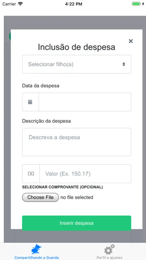 Espaço destinado ao lançamento de despesas, com possibilidade de anexar documento, com notificação ao outro pai, que poderá também carregar documento do respectivo ressarcimento de despesas, se for o caso.