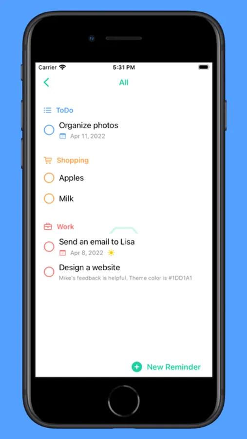 "ToDo List" is a simple app to manage your to-dos. You can use it for all of life's to-dos, including grocery lists, projects at work, etc. Widgets and notifications help you remember to do it. You can customize the app with a wide variety of colors and icons. If you enable iCloud, you can easily sync with your iPhone, iPad, or Mac and access your reminders anywhere.