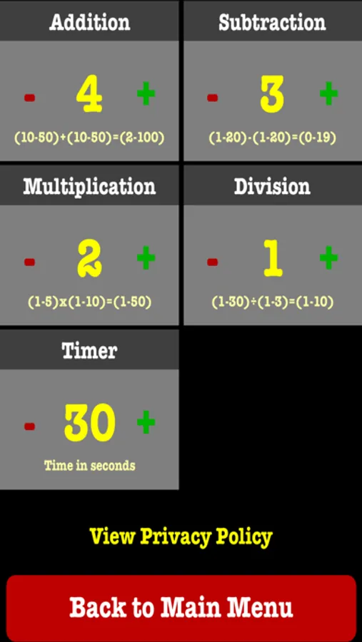 Rapid Math allows you to choose from level 1 to level 4 math questions. You can mix and match addition, subtraction, multiplication and division, choosing to quiz all types of problems or focus on a single type of arithmetic.