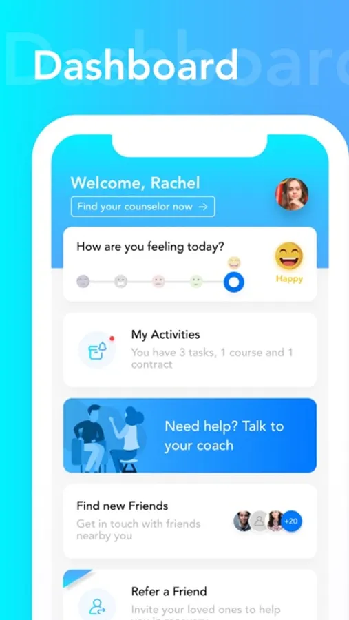 The patient app offers a mobile, on-demand connection with their provider and provides real-time accountability with required engagements and geo-fencing. It also fosters peer, family and friend support and engagement.