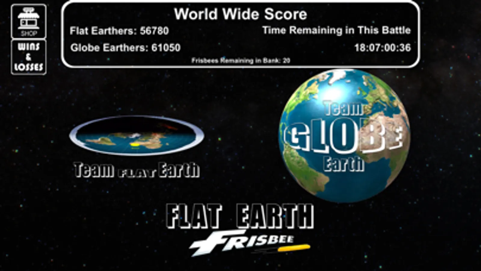It is the 21st century and there is still heated debate about whether or not the Earth is flat. Instead of yelling at someone, or worse, coming to blows, why not settle the debate here? With Flat Earth Frisbee, each month one side will win the argument by winning the global competition. It's simple! Choose a side to play for and hit as many targets as you can per round. Your score will then be added to the global score for your team! Every month a new winner is decided. You can look back to see who has won for each month.