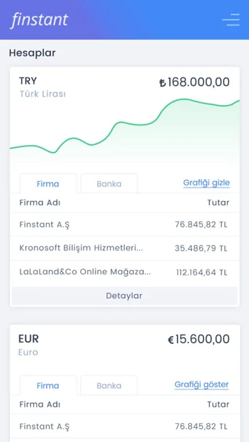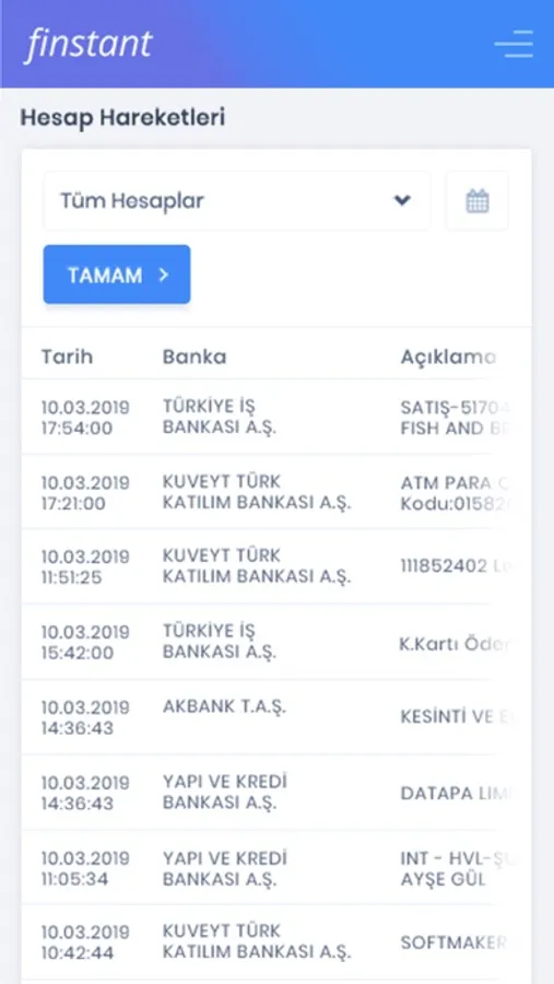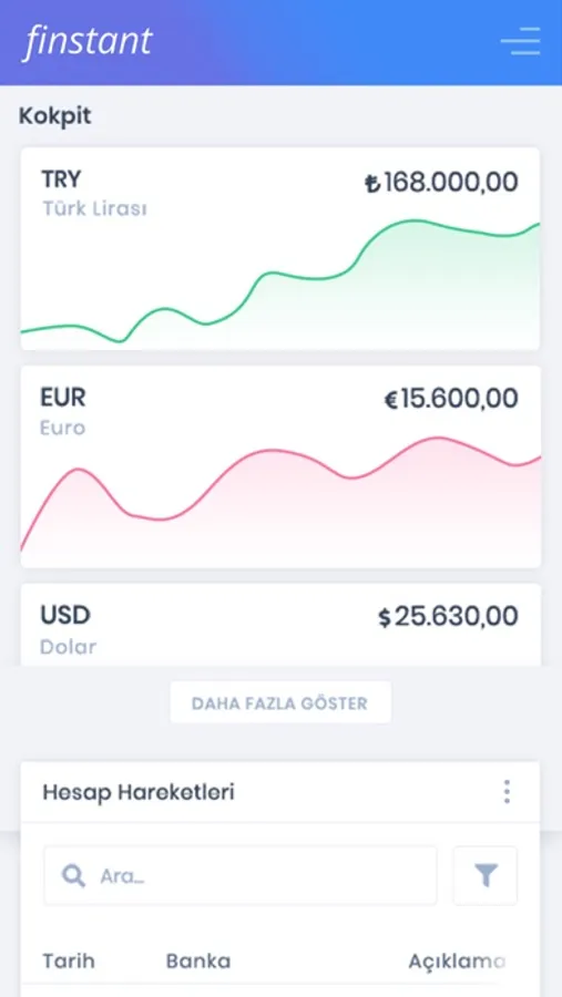 Finstant, tüm bankalardaki hesaplarınızın bakiyelerini ve hesap hareketlerinizi görüntülemenizin yanı sıra POS hareketlerinizi de görüntülemenize ve otomatik olarak tüm bu finansal hareketlerinizi ERP veya muhasebe programınıza aktarmanızı sağlar. Her bir bankaya ayrı ayrı giriş yapmak yerine Finstant ile tüm bankalarınıza tek bir uygulamadan erişebilirsiniz.