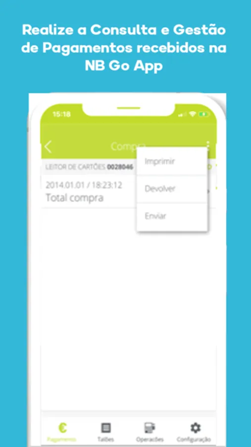 Com o NB Go do NOVO BANCO já pode receber o pagamento dos seus clientes, com cartão ou MB WAY, na hora e em qualquer lugar. Basta instalar a APP no seu smartphone e ligá-lo por bluetooth ao Terminal de Pagamento NB Go.Sem segredo, receber é mesmo a alma do negócio.