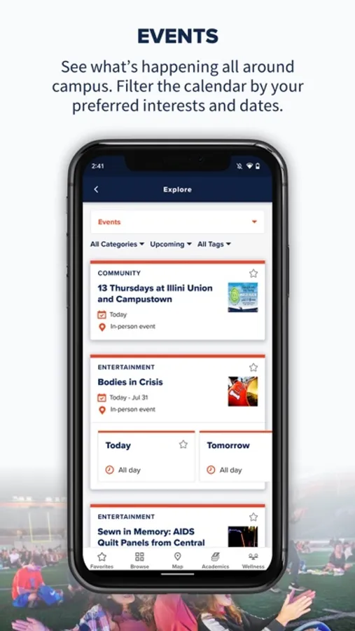 • Campus events (Fighting Illini sports, arts and culture, and more)