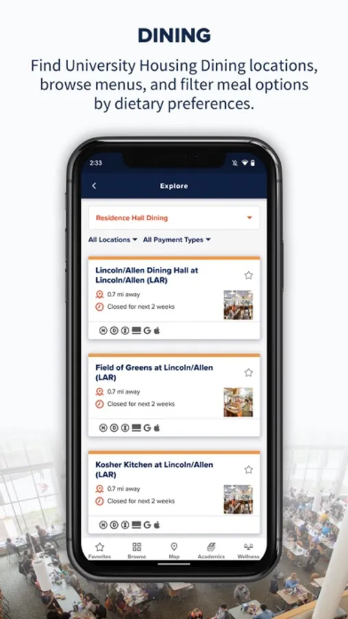 • Residence hall dining menus filtered by your food preferences — anyone with Illini Cash or a meal plan can dine with University Housing