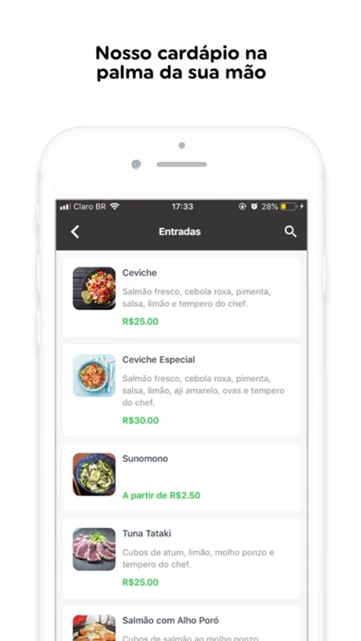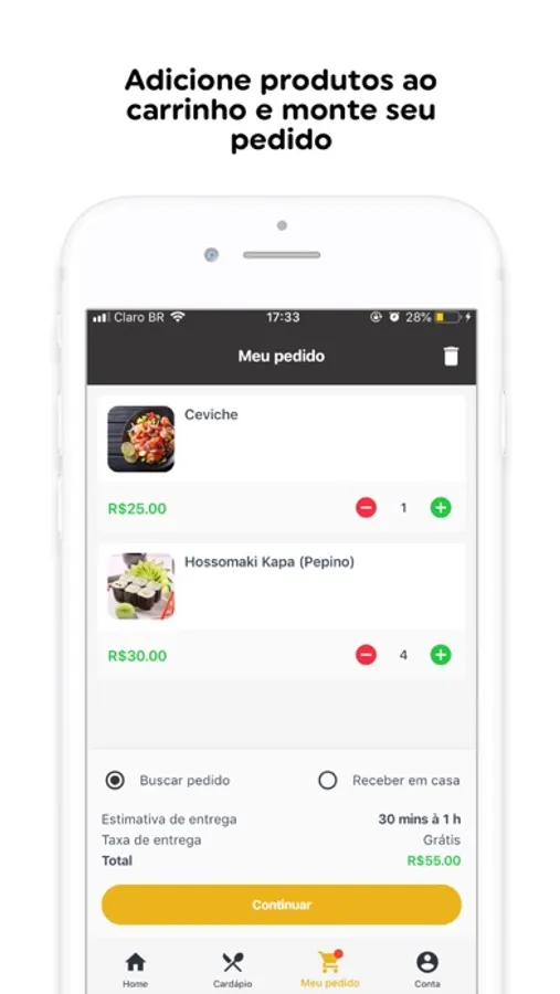 No app, você encontra de forma rápida o cardápio completo e ainda pode utilizar a ferramenta de busca para localizar diretamente os produtos que você deseja.