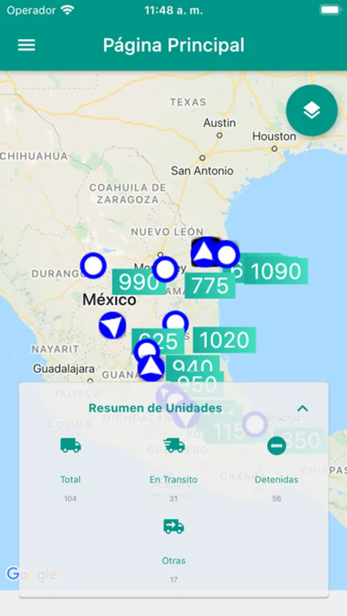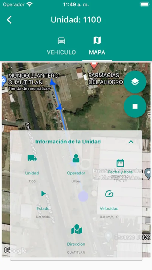 Sección de Mapa de Unidades: Se podrá elegir cada unidad de forma individual, permitiendo al usuario tener una visualización rápida del estatus del motor de la unidad y su ubicación. Y el recorrido de las ultimas 15 posiciones.