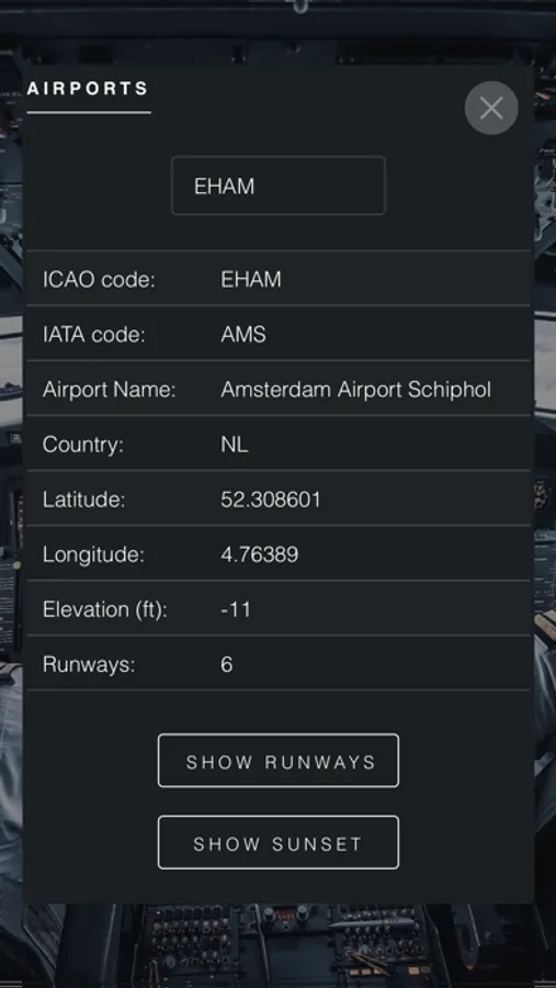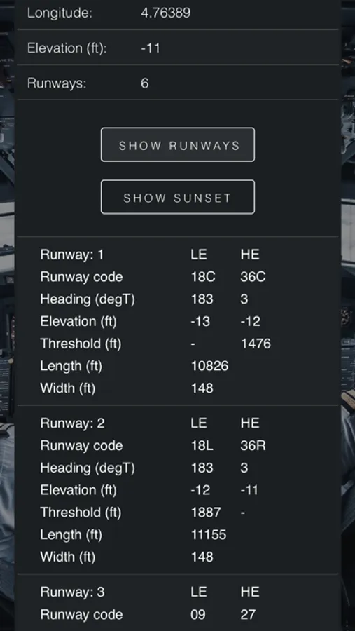 View the details of over 5500 airports. Including data like the name, IATA & ICAO code, coordinates, elevation, number of runways, runway details, sunrise/sunset times and more.