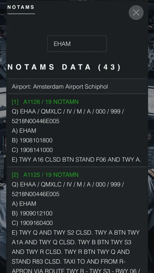 Look up the NOTAMS for your desired airports. Represented in a clear and comprehensible overview.