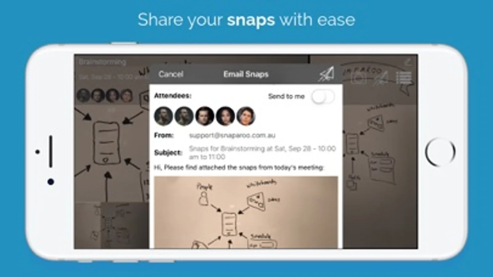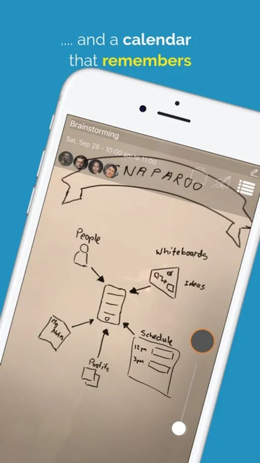 Every day thousands of photos of whiteboards and presentations are taken for work, university and school. Yet all this valuable information gets lost amongst our personal photos. Snaparoo knows your calendar and solves the problem by making all that valuable work photos easy for you to take and find and share.