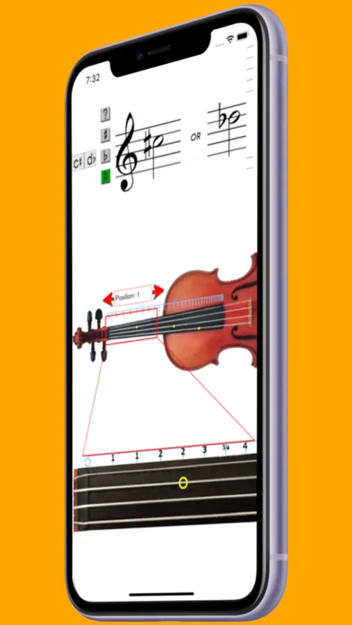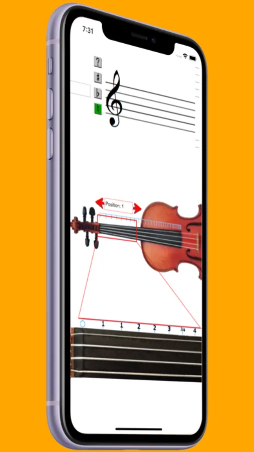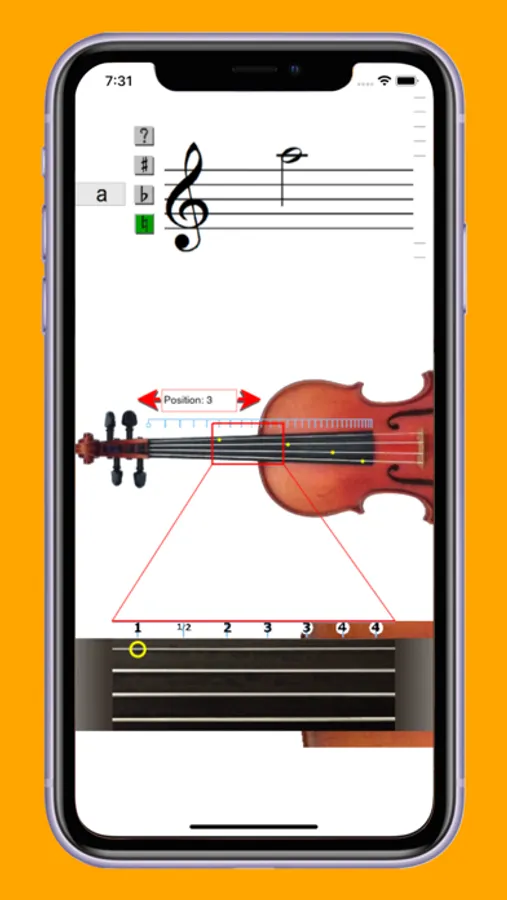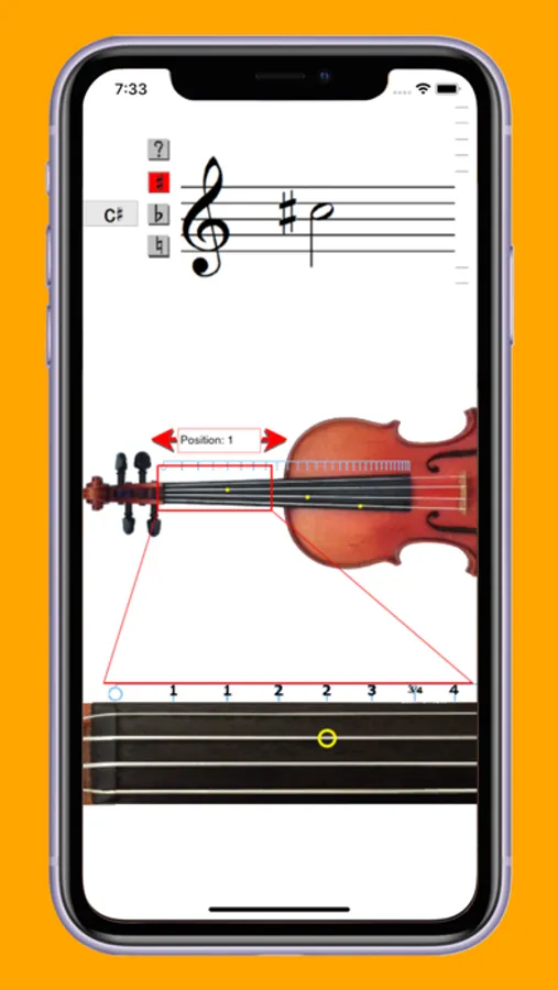You can tap on a staff to see where on the violin a certain note can be played. You will see this both on an overview picture of a violin in the middle of the screen, and on a picture of an enlarged position of the violin.