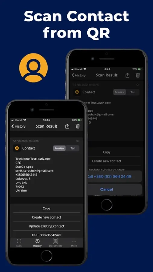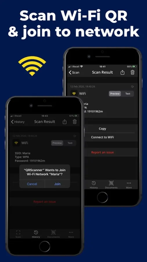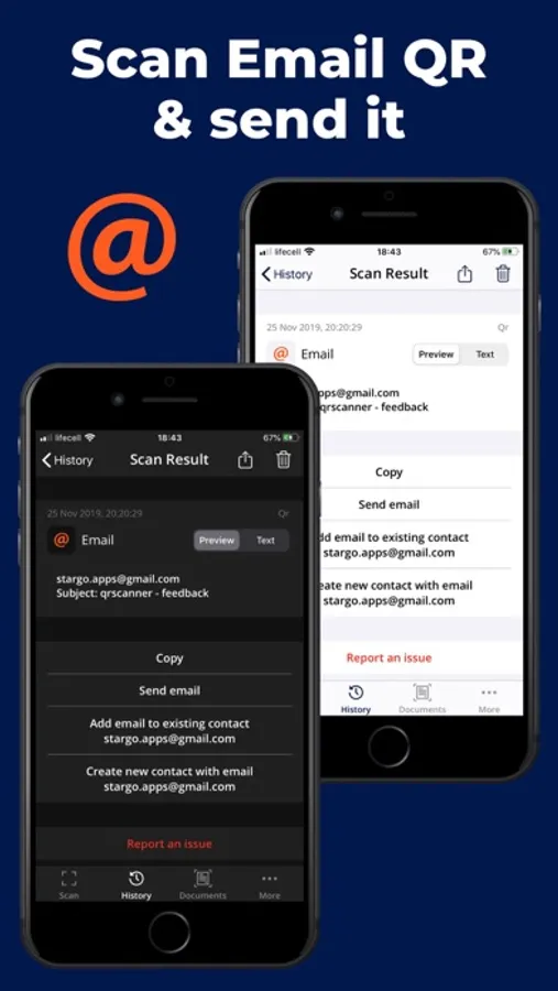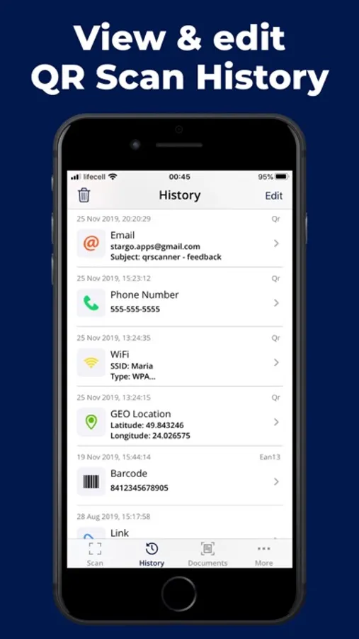 Scanner decodes information from 2-D codes (QR, PDF147, Aztec, Data matrix) such as: