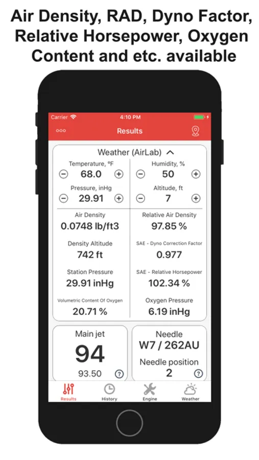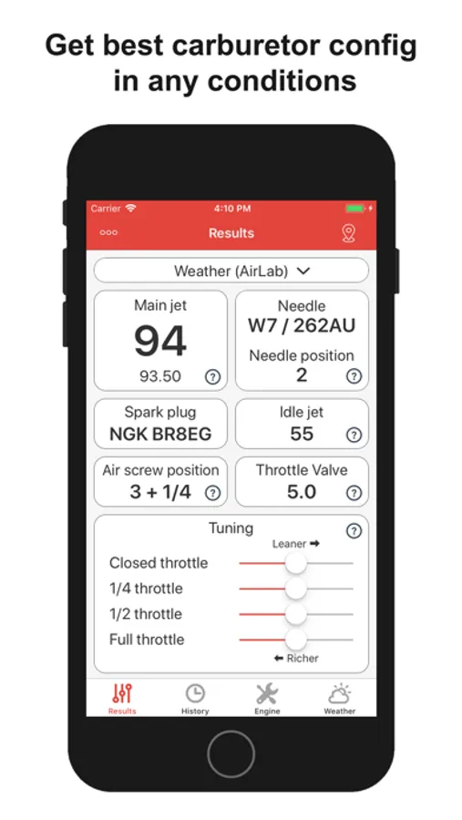 • Results: In this tab main jet, needle type, needle position, pilot jet, air screw position, throttle valve, spark plug are shown. These data are calculated depending on the weather conditions and the engine configuration given in the next tabs.