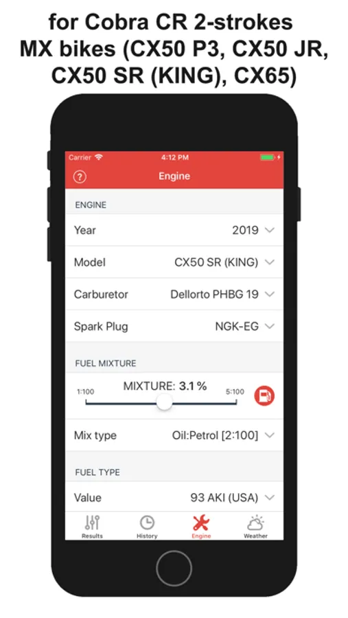 This app is using temperature, altitude, humidity, atmospheric pressure and your engine configuration for calculate optimal jetting (carburetor configuration) and spark plug to use for Cobra Moto 2-strokes MX (Motocross), Enduro, Dirt bikes.
