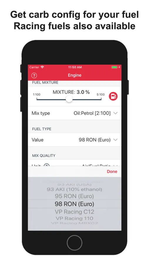 • Mix wizard to get the perfect mix ratio (fuel calculator)