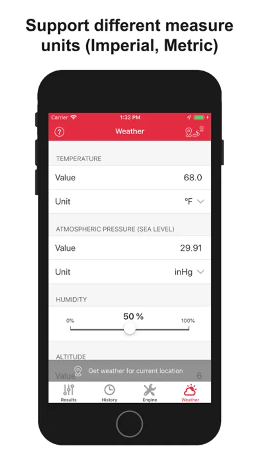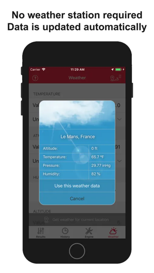 This app can obtain automatically the position and altitude to get the temperature, pressure and humidity from the nearest weather station thought internet. Internal barometer is used on supported devices for better precision. If more accuracy is needed, a portable weather station can also be used. Application can run without GPS, WiFi and internet, in this case user has to give the weather data manually.
