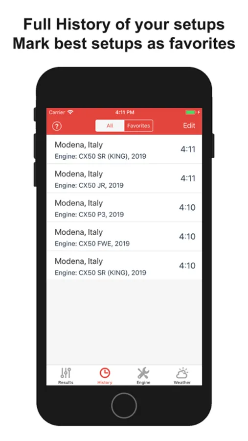 • History: This tab contains the history of all carburetor setups. If you change the weather, or engine setup, or fine tuning, the new setup will be saved in history.