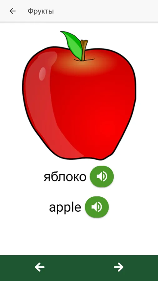 Вы не только видите слова в виде красивых картинок, но также можете их озвучить нажимая одну из кнопок с изображением динамика. Озвучка доступна как на русском, так и на английском языке.
