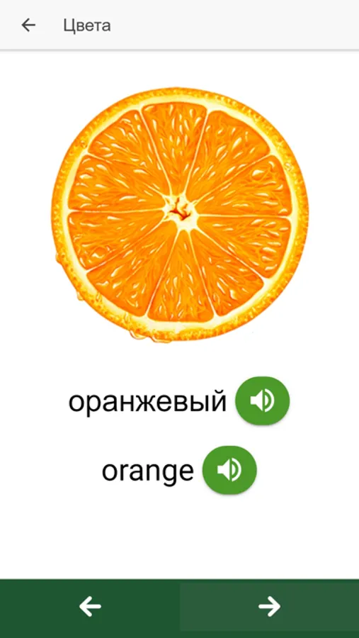 Приложение Веселый апельсинчик предназначено для развития речи, а также легкого и интересного обучения детей словам на русском и английском языке.
