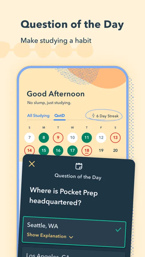 Scientific research shows that studying in short bursts over time is more effective than a handful of long study sessions. Our app is built with this in mind, giving you the power to study from your phone whenever and wherever it's convenient for you. Easily access practice questions while waiting in line, on public transit, on meal breaks, and more!