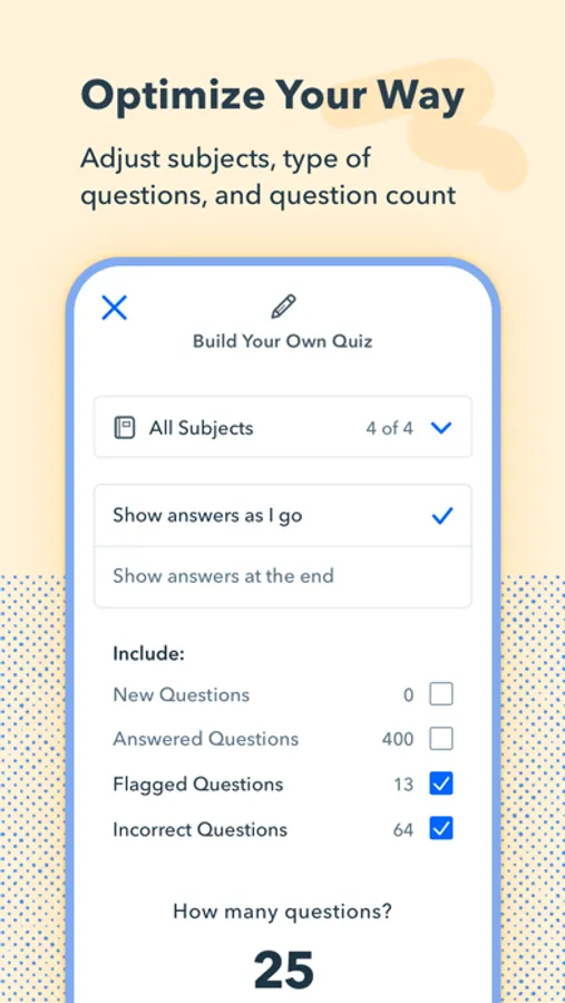 - Study progress shows how many questions are left in your study bank