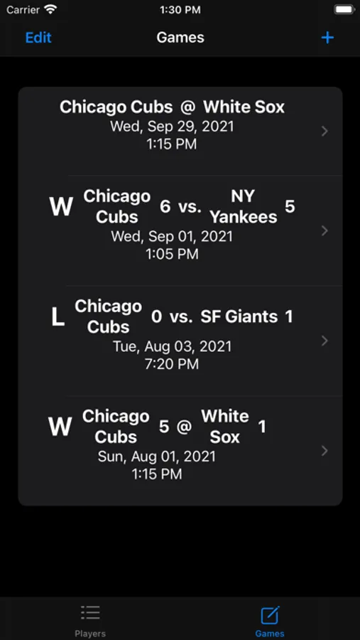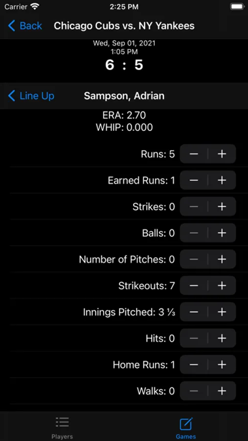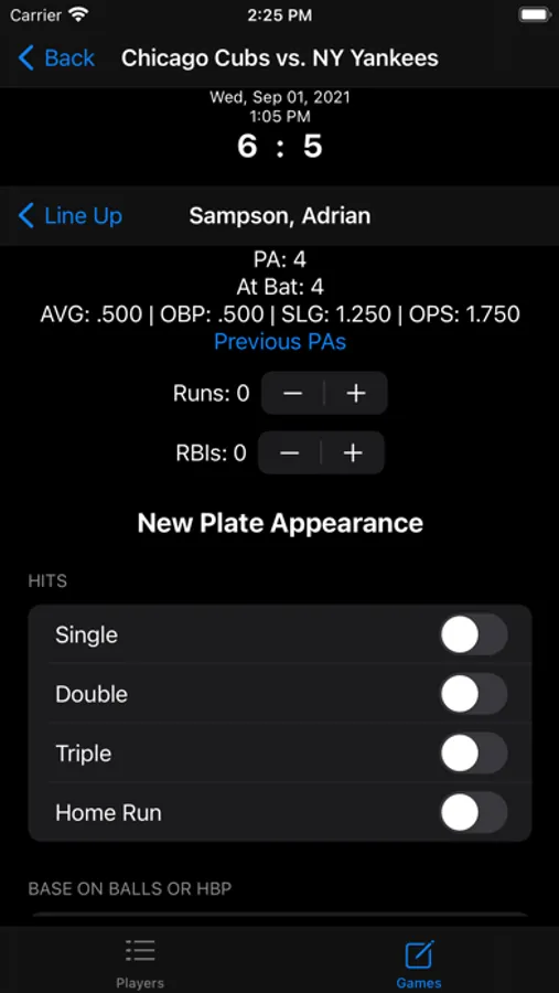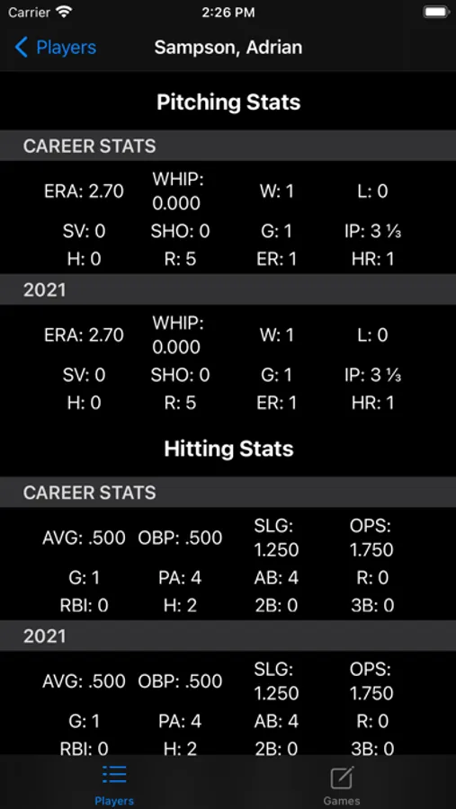 Baseball and softball stats keeper. Add unlimited number of games and players. See stats by game, year, or career of each player for both pitching and hitting.