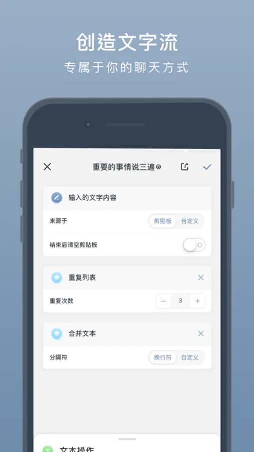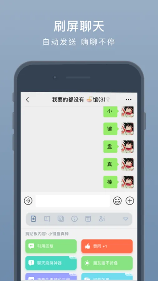 • 文字流:文字流是小键盘最核心的功能。创造文字流的初衷是我们希望能够提供一种灵活的方式来进行文本处理,它可以自定义不同的文本处理规则,还支持自动发送。 我们内置了许多常用的文字流,比如:“引用回复”,“聊天刷屏”,“朋友圈不折叠”,“竖排文本” 等,甚至还可以把一段文字加密成 emoji。有创意,就有无限的可能。 我们也会在微博上不定期分享一些有意思的文字流,可以关注我们的微博:@PicoApp,也欢迎给我们投稿!