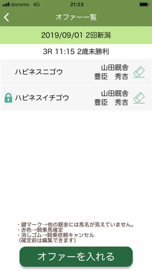 月ごとの開催カレンダーを見れば、内田騎手がどの競馬場で騎乗を予定しているかがすぐに分かります。競馬場のレース一覧を開けば、レース毎に依頼されている頭数も見られます。オファーの際は、レース名をクリックし、馬名を登録するだけ。馬名の公開、非公開も選べます。